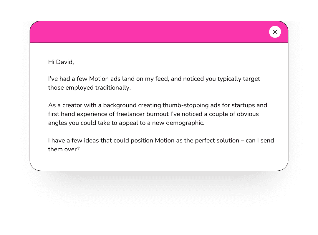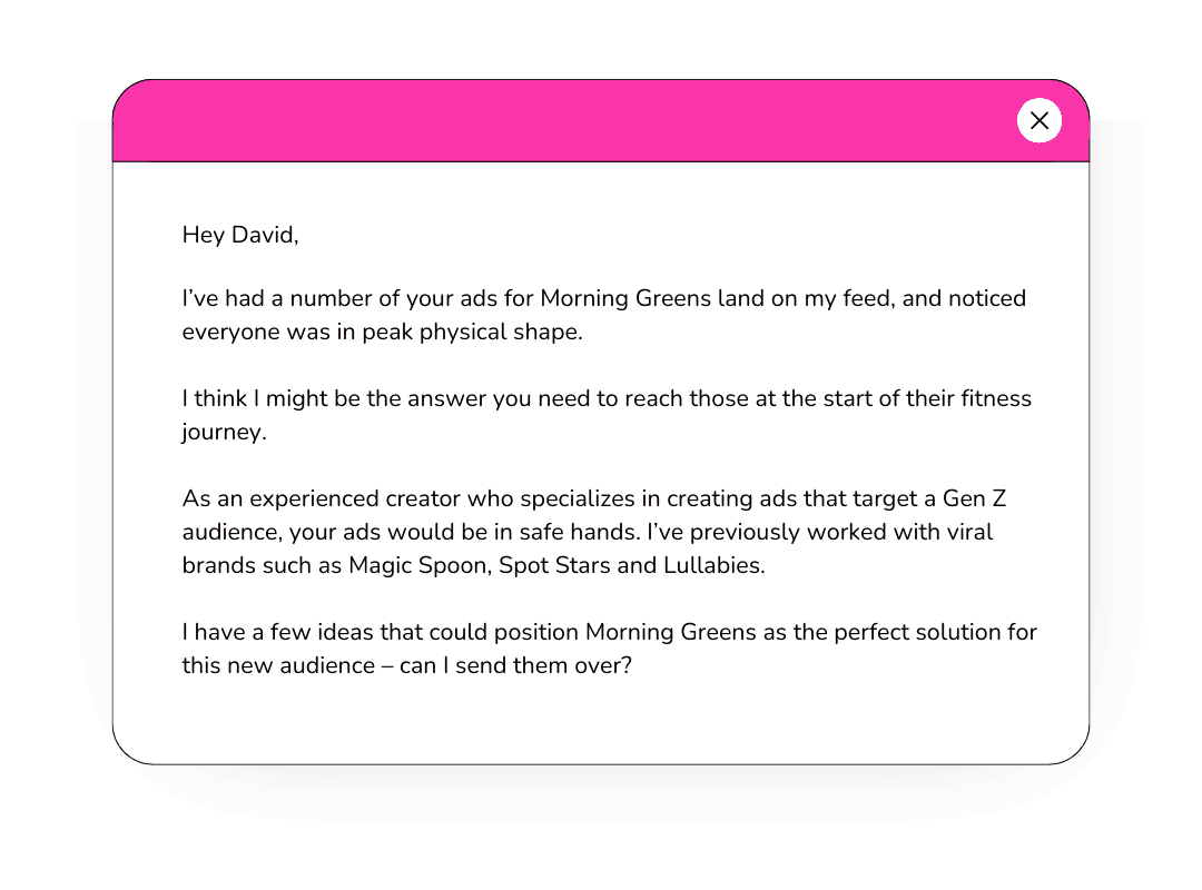 "I’m a content creator in the fitness space who’s worked with over 40 health & wellness brands in the last year. I know I could make your company an ad that would convert much better than your current creative."