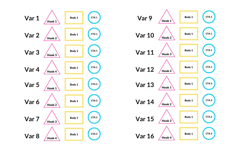 Then, they leverage all of the combinations of hooks, video bodies, and CTAs, to make many variations to test in their campaigns.